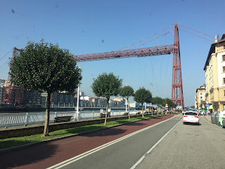Gestartet sind wir in unserem Übernachtungsort Sopelana und haben dann nochmals kurz einen Teil von Bilbao durchquert. Dort war auch unser erstes Highlight des Tages: wir sind mit unserem Carfield über die Schwebebrücke (Puente de Vizcaya) „geschwebt“. 🙂 Von einem Ufer zum anderen; das war richtig beeindruckend! Das ist die älteste Schwebefähre der Welt – seit 1893 ist sie in Betrieb!!! Seit 2006 zählt sie auch zu den zahlreichen UNESCO Weltkulturerbestätten. 45 Meter ist sie hoch und 160 Meter lang. Also zwar keine lange Fahrt, aber oho! 😉
