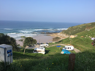 Nun sind wir in der Nähe der Stadt Llanes auf einem wunderschönen Campingplatz weg von allem Verkehr direkt an der Küste. Der Platz ist terrassenförmig angelegt, wir befinden uns ganz oben mit einem tollen Blick auf die Bucht. Nun wird gleich der Grill angeworfen und wir genießen die spanische Abendsonne. 🙂